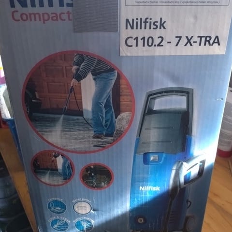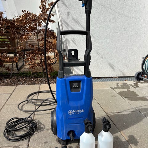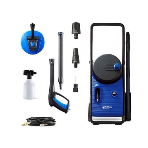 Nilfisk højtryksrenser i blå og sort med integreret slangerulle. Enheden har hjul og håndtag for nem transport samt opbevaring til kabel og tilbehør på bagsiden. Højtryksrenseren kan anvendes til rengøring af fx terrasser, indkørsler, havemøbler og køretøjer. Modellen leveres typisk med dyser og skumsprayer, som kan tilkobles fronten af maskinen, afhængigt af medfølgende udstyr.