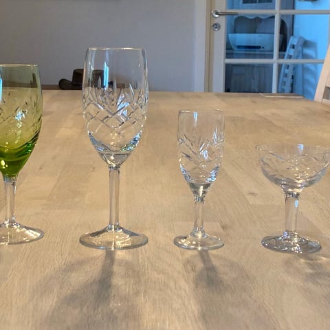 Holmegaard vinglas i klart og grønt glas. Glassene har stilk og let facetteret mønster i kuplen. Velegnet til servering af vin eller andre drikke ved borddækning. Sælges som blandet sæt med både klare og grønne glas.