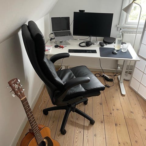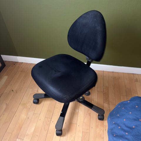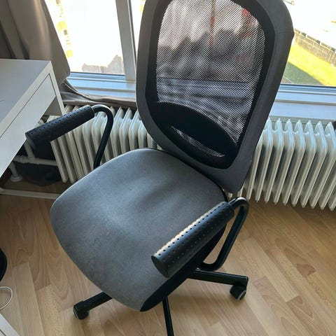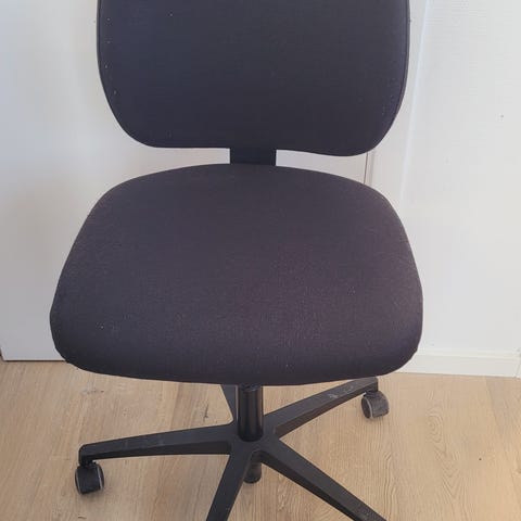 God robust kontorstol med armlæn og mange indstillings muligheder i rigtig god stand. Den er sort stof stolen er belæst med.