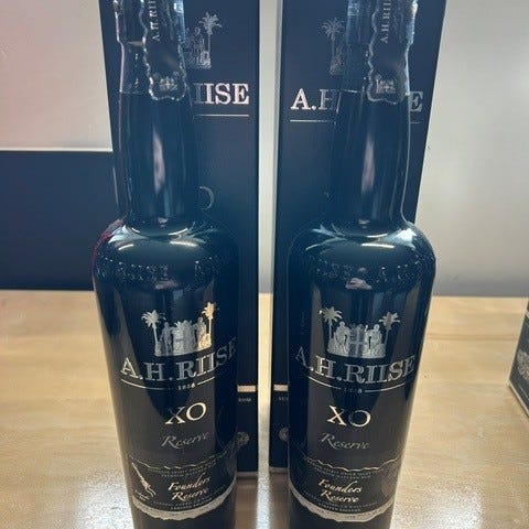 A.H. Riise XO rom. Flaskerne fremstår i mørkt design med tilhørende originale æsker. Velegnet som avec eller til samlere af A.H. Riise XO-serien.