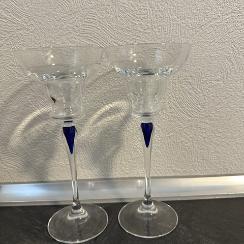 Venedig Safir lysestager med stilk i klart glas og blå detaljer på stilken. Sættet består af to lysestager i glas med bred skål og slank fod, velegnet til servering af f.eks. cocktails eller desserter. Højde ca. 19 cm. Diameter 8,5 cm. Designet kombinerer gennemsigtigt glas med en markant mørkeblå dråbeformet indlæg i stilken.