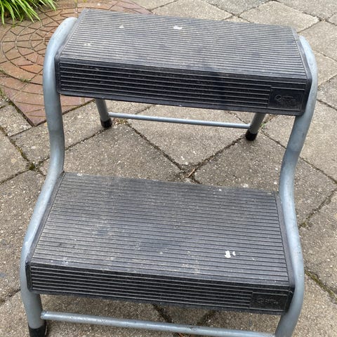 Trappestige med 2 trin i metal. Stigen har brede, skridsikre trin med mørk overflade og gummifødder for stabilitet på underlaget. Egnet til brug indendørs eller udendørs, f.eks. i hjemmet, garagen eller værkstedet til opgaver, hvor der er behov for lidt ekstra højde.
