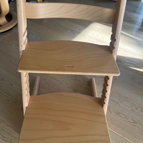 Tripp Trapp stol med lyserød bøjle og hjemmelavet rem.