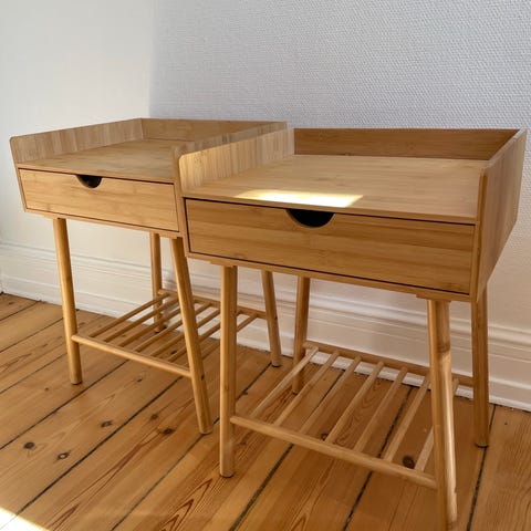 Sælger dette fine og enkle sengebord fra IKEA i bambus med glasplade. Perfekt som natbord eller lille sidebord.