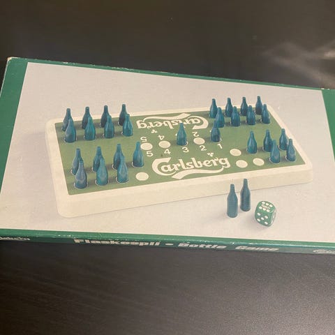 Carlsberg terningebægre i læder i farverne brun og sort. Begge bægre har kontrastsyninger langs kanterne og filt indvendigt, henholdsvis rød og grøn. Carlsberg-logo er præget i bunden af bægrene. Velegnet til terningspil og som samlerobjekt med øl- og Carlsberg-tema. Højde ca. 9 cm. Diameter ca. 7,5 cm.