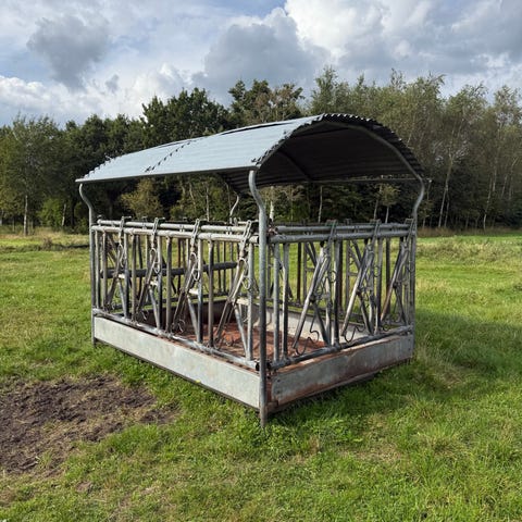 Rund foderkrybbe til kvæg i galvaniseret stål. Krybben er opbygget af sektioner med adskilte ædepladser rundt i hele cirklen, hvilket giver dyrene individuel adgang til foderet. Velegnet til brug på mark eller fold til udfodring af hø, wrap eller andet grovfoder. Galvaniseret overflade er beregnet til udendørs brug og gør konstruktionen robust og modstandsdygtig over for vejrpåvirkning.