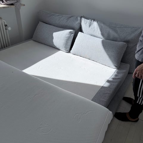 My home seng med velour sengegavl i grå velour tekstil. Sengegavlen har knapdetaljer og en blød, stofbetrukket overflade. Sengen egner sig til soveværelse og giver mulighed for behagelig støtte, når man sidder op i sengen. Madrassen kan man få gratis.