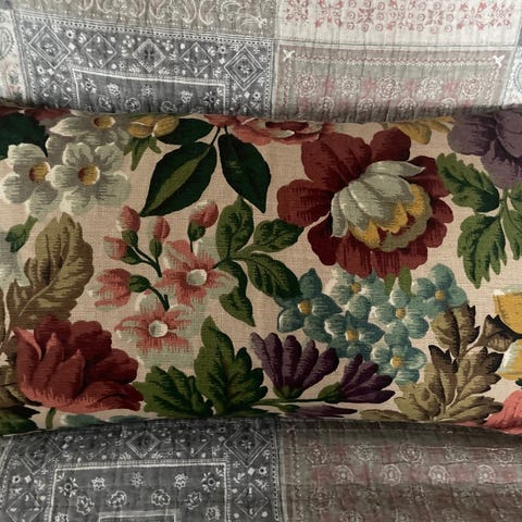Et chic sæt pudebetræk lavet af Sanderson-stofet "Stapleton Park" i farven "cream/rosa" (53% lin, 35% bomuld, 12% nylon) og bagsiden lavet med en ædel velour i
