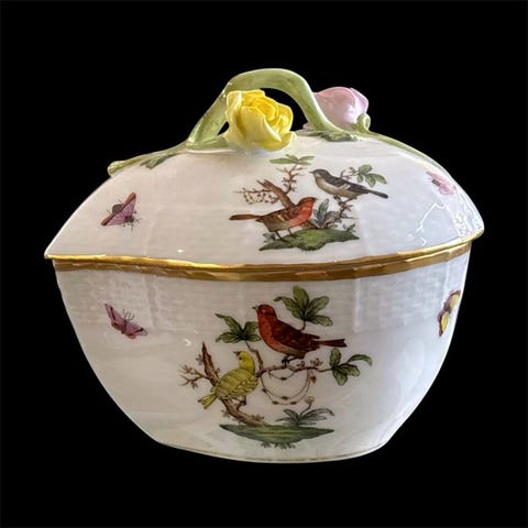 Fortryllende stort serveringsfad produceret af Herend - “Rotschild Bird” kollektion, velkendt håndmalet mønster med fugle, der sidder på grene og spredte insekter, i fremragende stand.