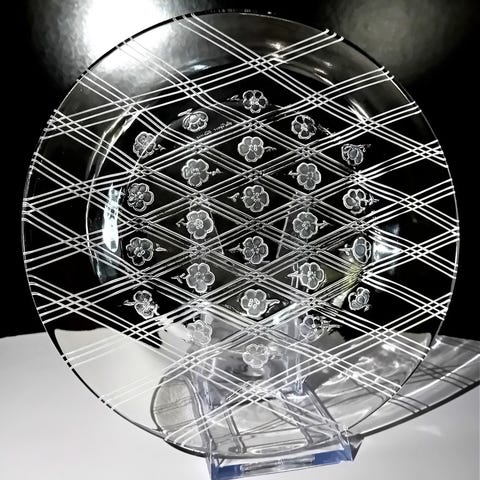 Motivet er arrangeret i en cirkel på kanten, med et mere sobert og gennemsigtigt centrum.