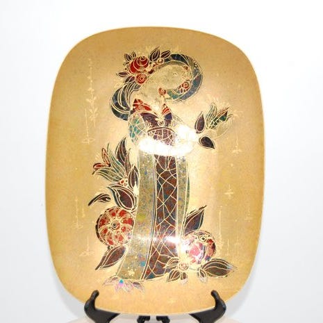 Fadets har en raffineret central dekoration i gyldne nuancer, med en stiliseret figur samt blomster- og naturmotiver, typiske for Wiinblads kunstneriske sprog. Overfladen er beriget af en delikat relieftekstur, der yderligere fremhæver objektets elegance.