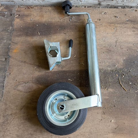 Støttehjul til trailer med hjulstørrelse 200x50 mm. Rørdiameter ca. 48 mm og samlet højde ca. 550 mm. Inkluderer beslag og monteringsbolte som vist på billedet. Håndsving i toppen til justering af højde, egnet til montering på trailertræk for støtte ved af- og påkobling samt manøvrering af trailer.