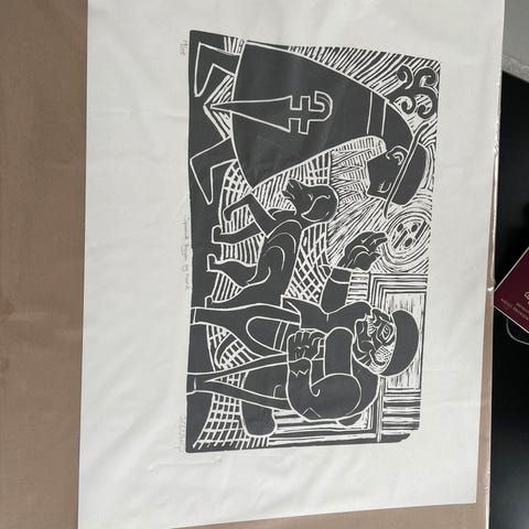 Peter Land med flot og velholdt træsnit “What a life” i farver.