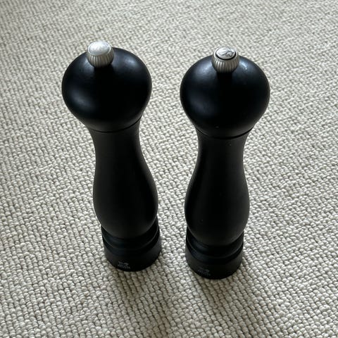 Sælger et sæt bestående af salt- og peberkværn fra Peugeots populære Paris serie i 22 cm, glossy black finish. Fremstillet i bøgetræ.