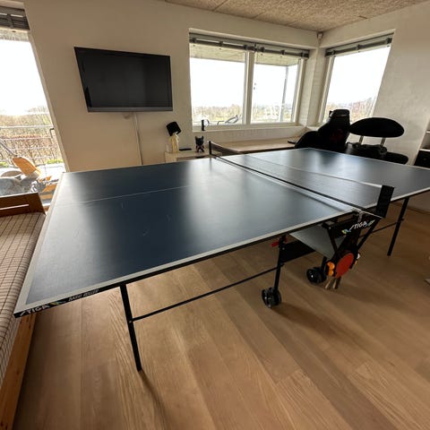 Bordtennisbord på hjul i blå farve, fra mærket Stiga. Standard størrelse bord med net og sammenklappeligt stel. Bordet står på hjul, hvilket gør det nemt at flytte og opbevare. Velegnet til brug i indkørsel, garage eller på terrasse, hvor der er plads til bordtennis. Der følger 2 bordtennis bat med og et par bolde.