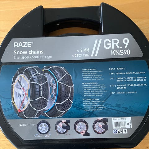 Raze GR.12 KNS120 snekæder til bil. Snekæderne er 9 mm og leveres i plastkuffert med bærehåndtag. Modellen passer til flere dæksstørrelser, blandt andet 225/70-15, 215/65-16, 225/60-16, 235/60-16, 235/55-17, 245/45-17 og 245/45-18. Velegnet til brug på sne- og isglatte veje, hvor ekstra vejgreb er påkrævet. Monteres på drivhjulene efter producentens anvisninger og må kun anvendes på underlag, hvor brug af snekæder er tilladt.