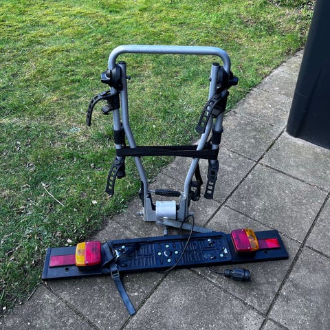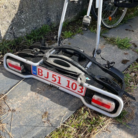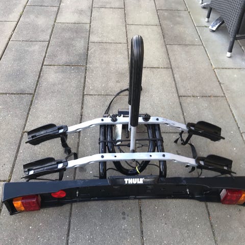 Thule cykelholder til 2 cykler og anhængertræk med integreret lys og nummerpladeholder. Cykelholderen monteres på bilens anhængertræk og tilsluttes via 7-polet stik til bilens el-system, så baglys, bremselys og blinklys fungerer sammen med bilen. Egnet til transport af cykler bag på bilen, hvor cyklerne fastgøres på holderens ramme og skinner. Nummerpladen kan monteres på den bageste skinne, så den er synlig under kørsel.