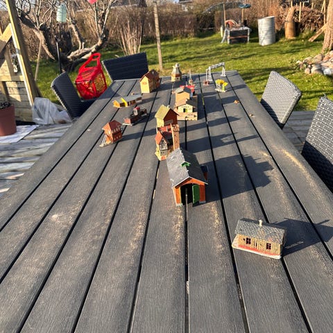 Modeltog sæt med flere lokomotiver, vogne, biler og diverse tilbehør. Sættet indeholder lige og buede skinner, transformer/styreenhed, samt mange bygninger og huse i forskellige størrelser og farver til opbygning af en modelby. Velegnet til opbygning eller udvidelse af et modeljernbaneanlæg. Målestok og mærke er ikke angivet og kan variere mellem de enkelte dele.