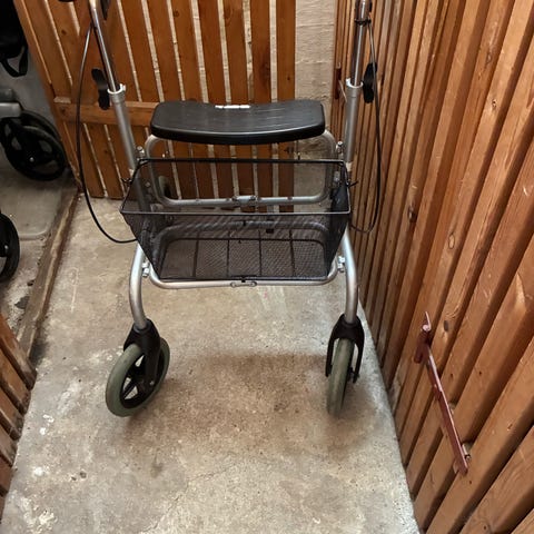 Rollator med sæde og ryglæn. Modellen har fire hjul, to håndbremser og sammenklappelig ramme. Der er indbygget siddesæde samt polstret ryglæn for støtte under pauser. Rollatoren er egnet til personer med behov for støtte ved gang både indendørs og udendørs, afhængigt af underlag. Justerbare håndtag giver mulighed for tilpasning til brugerens højde.