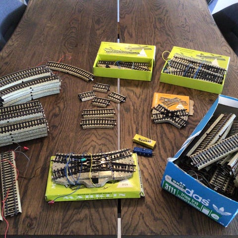 Der er et lokomotiv, 8 togvogne, 25 stk. Lige skinner, 20 stk buede skinner, 4 små wiking biler + alt det andet på billeder.