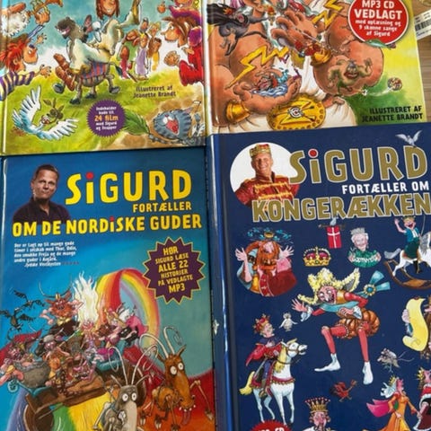 “Sigurd fortæller om de nordiske Guder” illustreret af Stine Rosenberg. “Sigurd kan gøre alt spændende for børn: opera, symfoniorkestre, biblen. Nu fortæller han alle historierne fra den nordiske mytologi, fra verdens tilblivelse til Ragnarok. Gudernes kampe mod jætterne, menneskene der sidder midt i det hele i Midgård, myter om hvorfor verden er, som den er, om Thor og Odin og smukke Freja, alle er med, når Sigurd fortæller om de nordiske guder.” Hardback i rigtig fin stand - hør Sigurd læse alle 22 historier på vedlagte MP3👌🏻✨