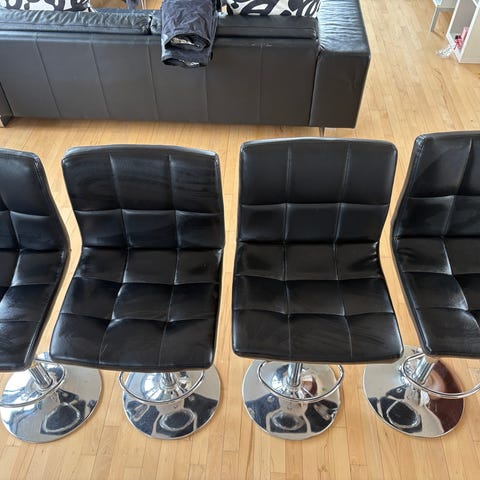 Flotte og stilrene barstole i mørkebrunt ægte kernelæder. Solid kvalitet med fast stel og fodstøtte i metal.