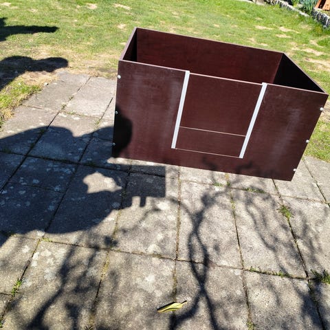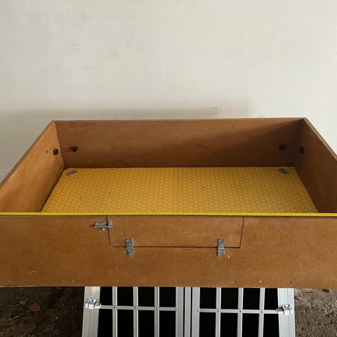 Lavet i ubehandlet træ - med lister så hvalpene ikke bliver klemt samt låge så hvalpene bliver i kassen(så længe det varer😅).