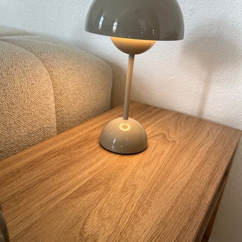 &Tradition Flowerpot VP9 bordlampe i messing. Designet af Verner Panton. Transportabel lampe med indbygget batteri og opladning via kabel.