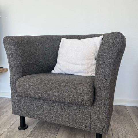 Lænestol i grå med sorte ben.