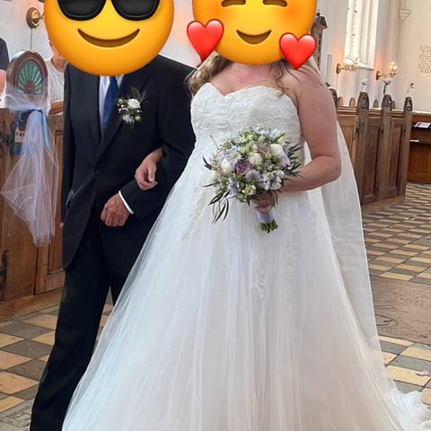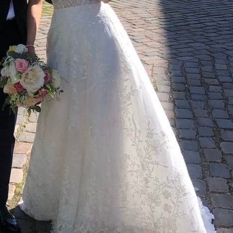 Brudekjole i hvid i str. M. Kjolen har blondeoverdel med bredde stropper og gennemsigtig blonde ved hals og øverste ryg. Ryggen lukkes med knapper. Nederdelen er vid og lang med flere lag stof og diskrete blondeapplikationer. Velegnet som klassisk brudekjole til kvinde, der bruger størrelse M.