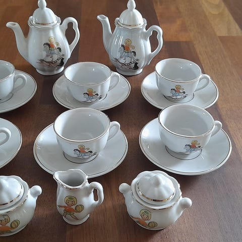 Køkken, Kaffestel, Ukendt, Sødt lille dukke sæt i porcelæn med 3 tallerkener, 3 kopper og 2 kander. Kommer fra et ikke ryger hjem. Sælges samlet for kr. 40