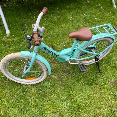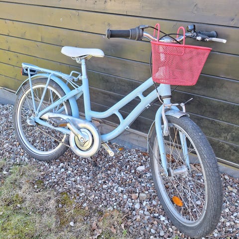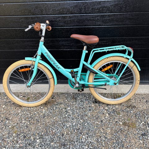 Everton Freeway børnecykel med 20” hjul. Cyklen har blå stel, hvide dæk, sadel og håndtag. Udstyret med bagagebærer, skærme og reflekser. Velegnet som hverdagscykel til piger 6–9 år, der passer til 20” hjul.