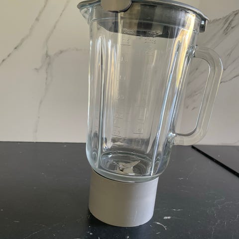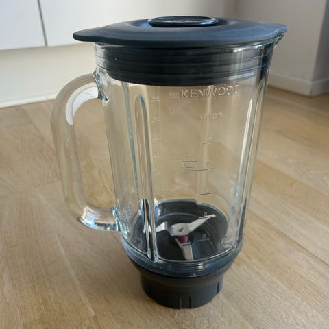 Kenwood blenderkande i glas med låg og integreret håndtag. Kanden har tydelige måleangivelser på siden og firebladet kniv i bunden. Velegnet som reservedel eller ekstra kande til kompatible Kenwood blendere. Farve: gennemsigtig glas med mørkegråt plastlåg.
