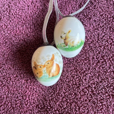 Påskeæg fra Royal Copenhagen i porcelæn med blomsterdekorationer. Sættet består af to påskeæg med guldfarvet top og lyserød snor til ophængning. Velegnet som påskepynt til ophæng i vindue, på grene eller andre dekorative arrangementer i hjemmet i påsken.