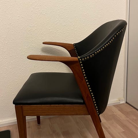 Fabrikeret i teak og kunstlæder, fremstår pæn og brugbar med almindelige brugsspor. Ikke ryger, ikke dyrehold.