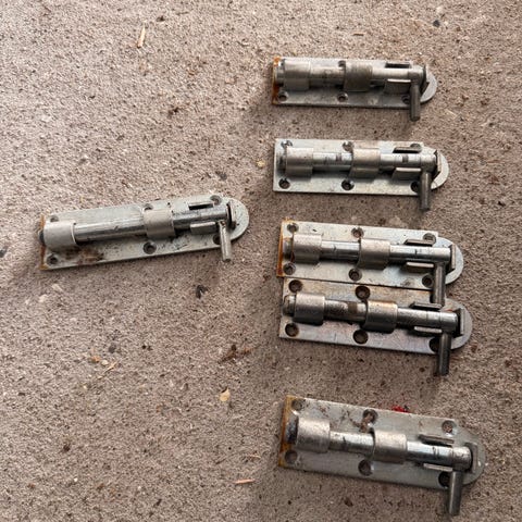 Skudrigle dørbeslag i galvaniseret stål. Længden er som vist på billedet med lineal. Beslaget har rektangulær monteringsplade med flere skruehuller til fastgørelse på dør eller port. Egnet til simpel mekanisk aflåsning af døre, porte, skure eller lignende, hvor der ønskes en glidende rigle, der kan føres ind i et modstående beslag eller hul.