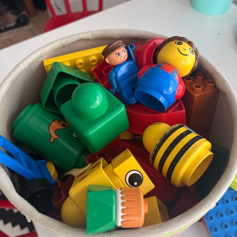 Pose med blandet legetøj til børn i alderen 0-2 år. Medfølger bl.a. klodser, sanselegetøj etc.