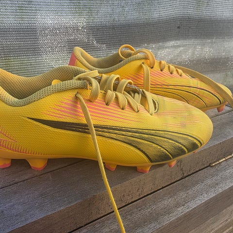 Puma børnefodboldstøvler i størrelse 32. Modellen er i hvid med orange detaljer og sort inderside. Overdelen er i syntetisk materiale med snørebånd kombineret med velcrolukning for bedre pasform. Ydersålen har faste knopper, der er velegnede til spil på græsbaner. Egnet til børn, der spiller fodbold udendørs.