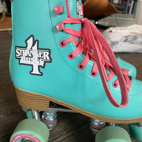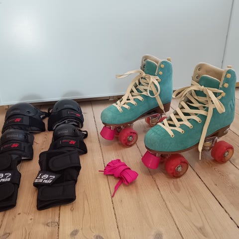 Nessie STAR / Tempish rulleskøjter i størrelse 40. Klassiske side-by-side rulleskøjter i turkis ruskind med lyse snørebånd. Rulleskøjterne har høj støvle med polstret skaft og hælkappe for støtte om anklen. Egnede til rulleskøjteløb på glatte underlag som asfalt eller indendørs gulve. Brugt en gang indendørs.