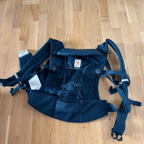 Ergobaby bæresele i navy/blå. Selen har polstrede skulderstropper og bred hofterem med spænde. Den er udstyret med frontlomme samt justerbare remme for tilpasning til bærer og barn. Egnet til at bære barnet tæt på kroppen ved hverdag og transport.