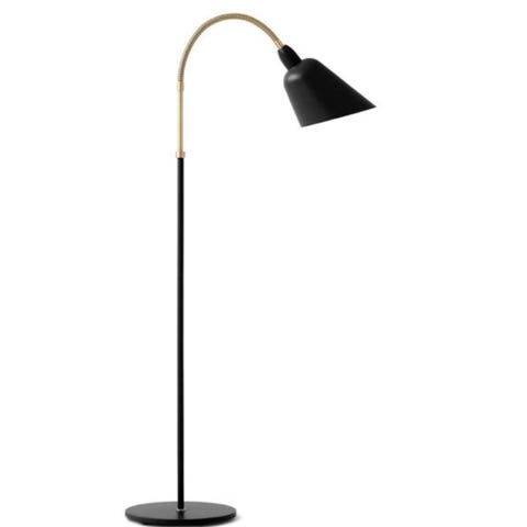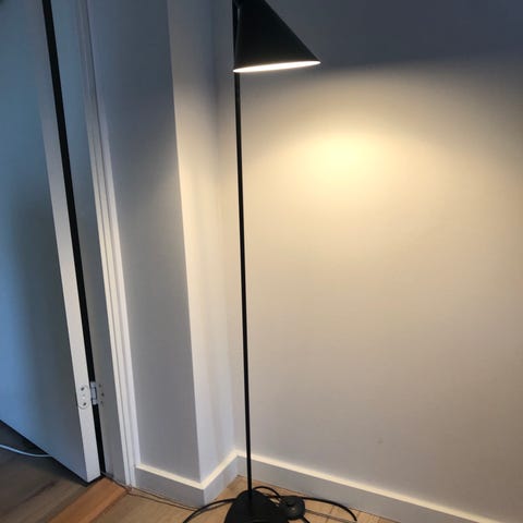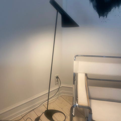 Fritz Hansen Arne Jacobsen gulvlampe i sort. Lampen har buet metalstativ med rund fod og justerbar lampeskærm, der giver retningsbestemt lys. Egnet som læselampe ved sofa eller stol samt som generel belysning i stue eller arbejdsområde.