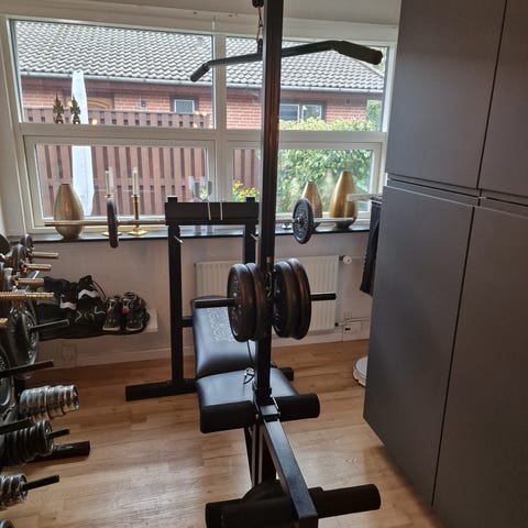 komplet styrketræning multistation, vægtstativ, 317 kg vægtskiver, stænger m.m.