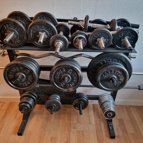 Vægtskiver i alt ca. 317 kg så du behøver ikke hele tiden at flytte rundt på skiverne, der er rigeligt med vægte til det hele.