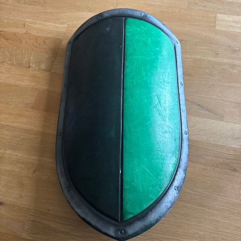 Rundt skjold med sværdmotiv på forsiden. Skjoldet har håndtag og remme på bagsiden til at holde eller bære det. Velegnet som udklædningstilbehør, dekoration eller rekvisit til liverollespil og teater.