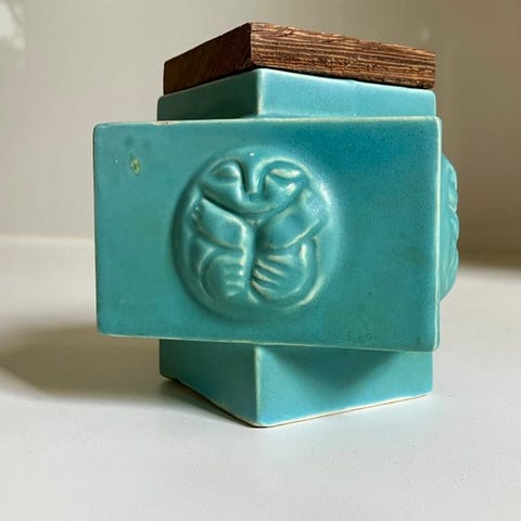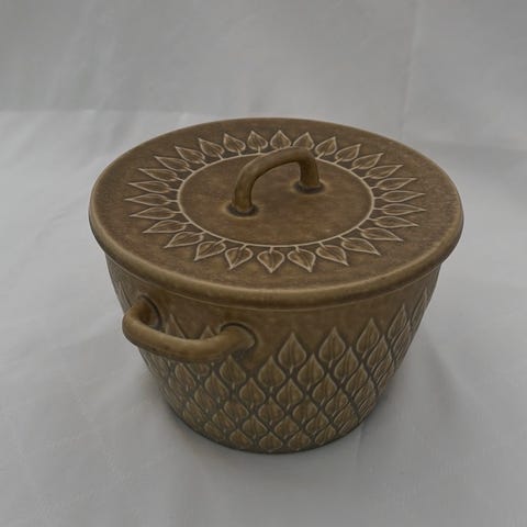 Af tysk oprindelse. Er 50+ år gammel, husker at mine forældre fik den i starten af 70erne. Røgfri og fri for skår. Oprindeligt har den været brugt til årstidens frugter dækket af stærk rum og sukker, og så tilført efterhånden som nye frugter modnes. Smager helt fantastisk som dessert op mod jul... Men også velegnet til andet, er glaseret indvendigt. Eller bare til dekoration.