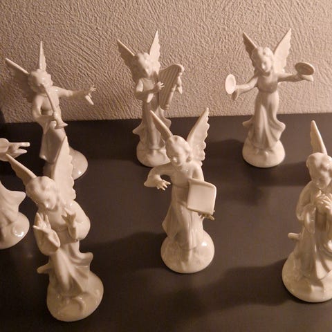 Engleorkester, 5 hvide engle med instrumenter i biskuit porcelæn. Fra 1971. 9 cm høje.