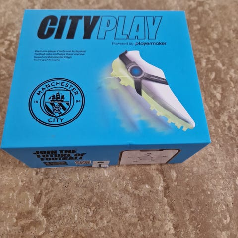 Playermaker 2.0 fodbold-tracker sæt til analyse af præstation på banen. Sættet omfatter sensorer, skobeslag til montering på fodboldstøvler, oplader og opbevaringsetui.