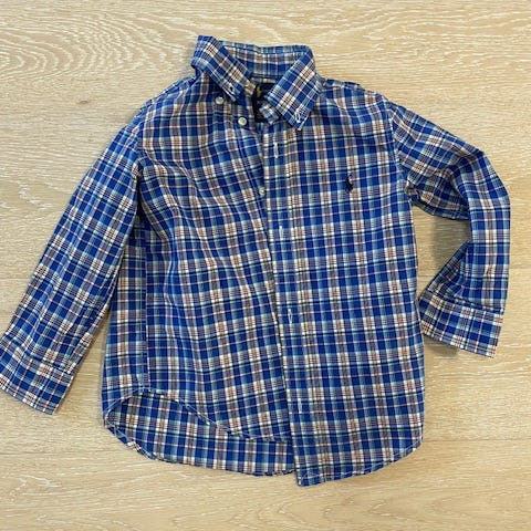 Ralph Lauren skjorte til dreng i str. 104. Skjorten er i blå ternet bomuld med klassisk krave og gennemgående knaplukning foran. Den har lange ærmer med manchetter samt broderet logo på brystet. Velegnet som hverdags- eller pænt tøj til børn i størrelse 104 (4 år).