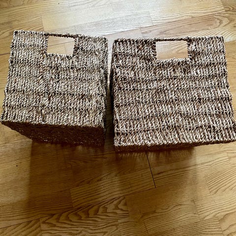 IKEA flettede opbevaringskurve med låg i naturfarvet materiale. Sættet består af tre runde kurve i forskellige størrelser, alle med matchende låg. Kurvene egner sig til opbevaring af småting som smykker, nøgler, kontorartikler eller andre mindre genstande.
