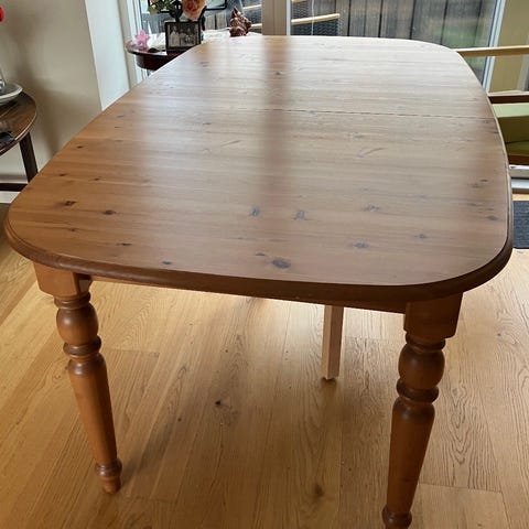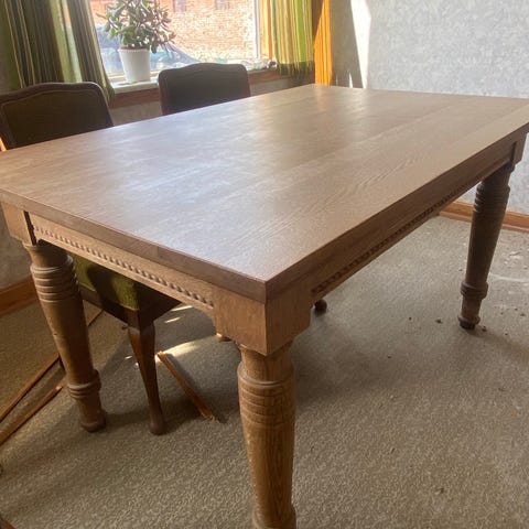Trænger til en let slibning på bordpladen og lak. Det er egetræ.